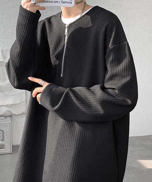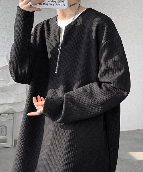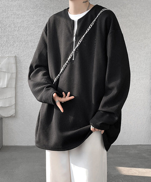 立体感のある生地を使用し、シンプルながら存在感のある表情に仕上げたハーフジップの長袖Tシャツ。
