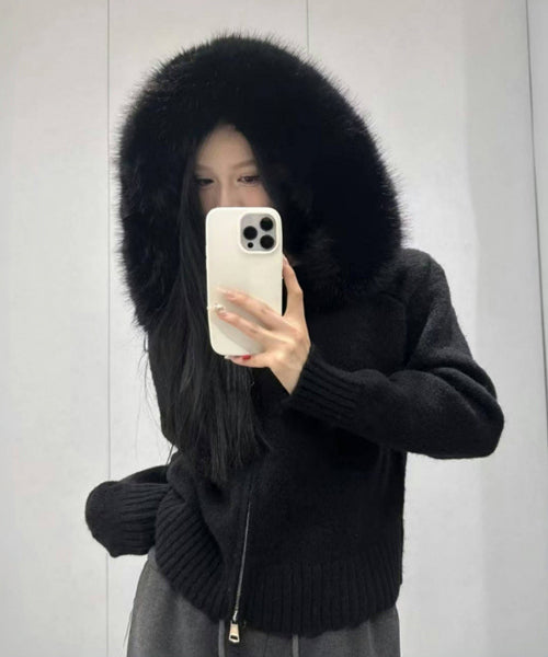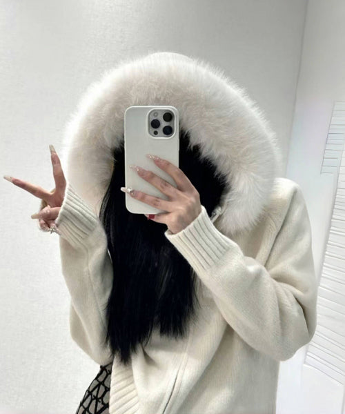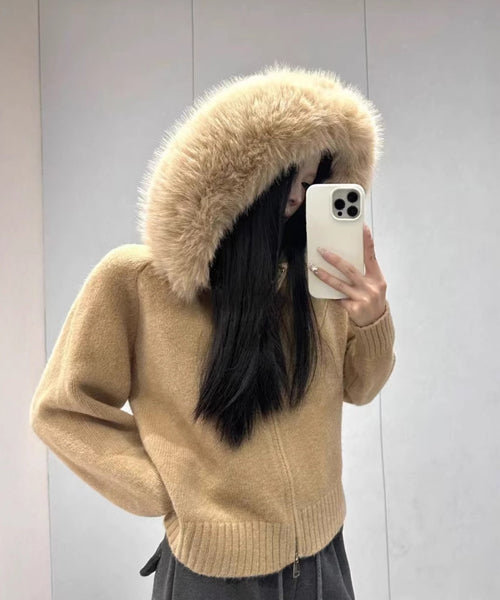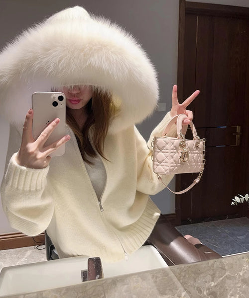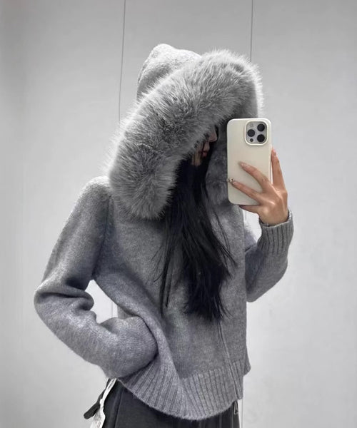 取り外し可能なファーが付いた、存在感抜群のニットパーカー。