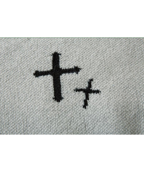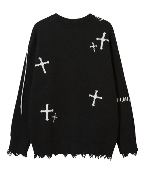 インパクト抜群のダメージ加工やハンドステッチ、また全体に施されたクロス柄が視線を引きつけるディテール。