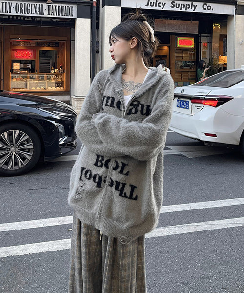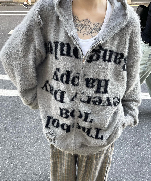 フロントのレタリングロゴとダメージ加工が存在感抜群のフード付きジップパーカー。