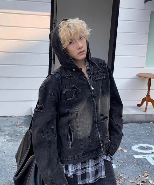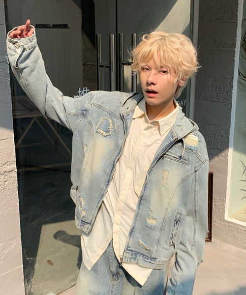 全体に施されたダメージ加工とユーズド感のある色落ちが、こなれたストリートムードを演出するデニムブルゾン。