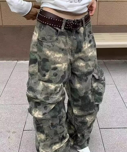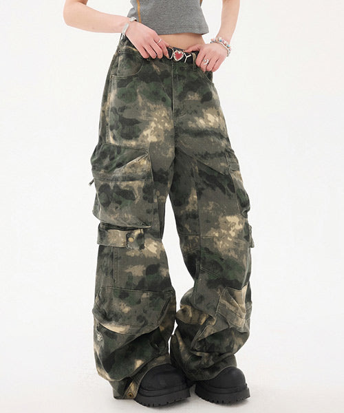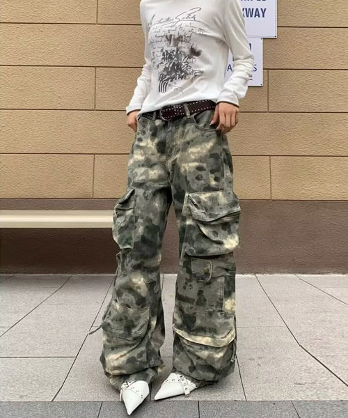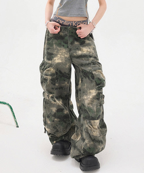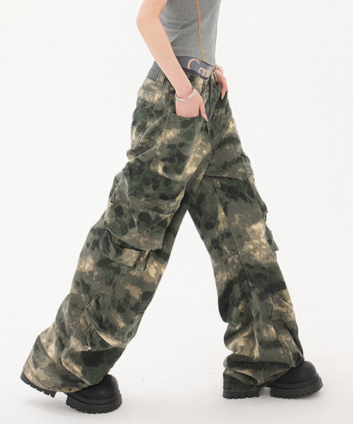 トレンド感のあるワイドシルエットでストリートムードたっぷりな迷彩柄カーゴパンツ。