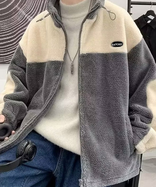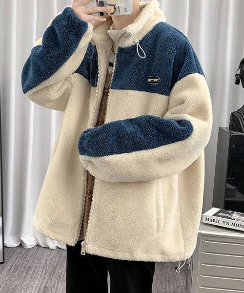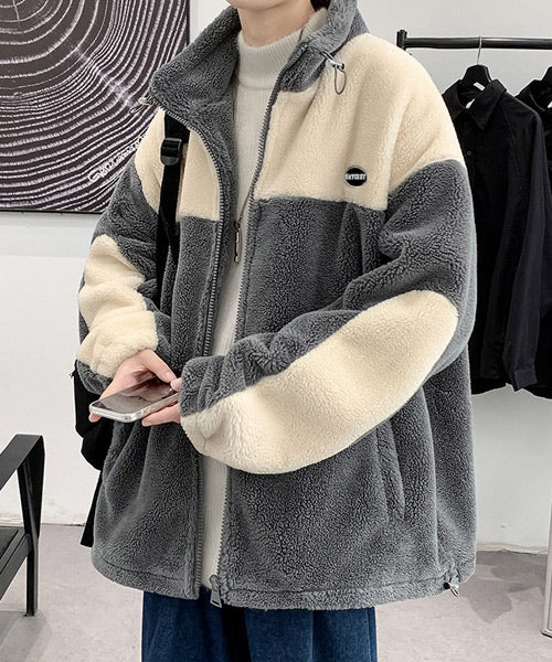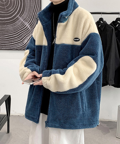 フロントのワンポイントロゴと配色デザインが、シンプルながらもアクセントになったボアブルゾン。