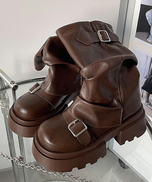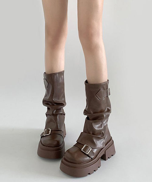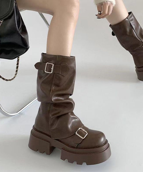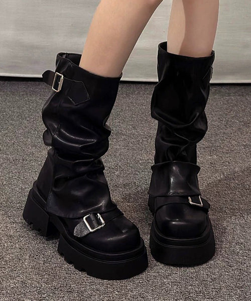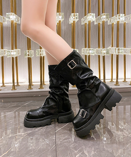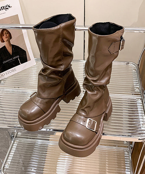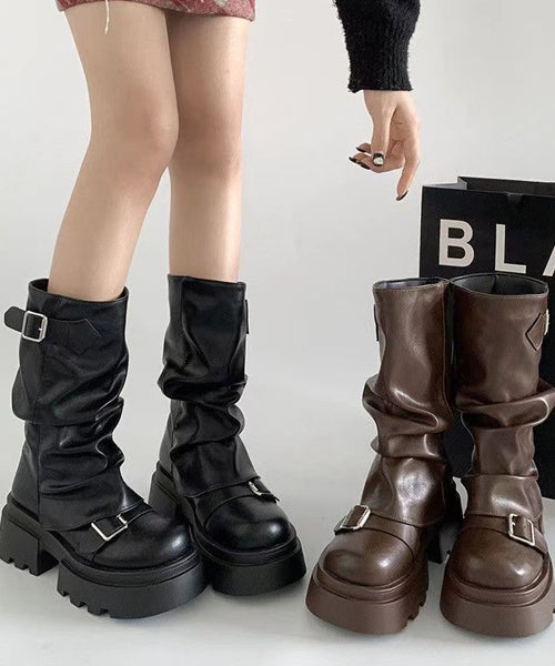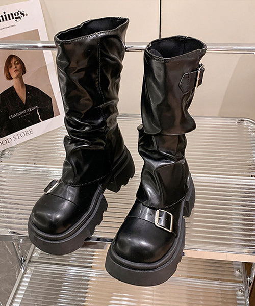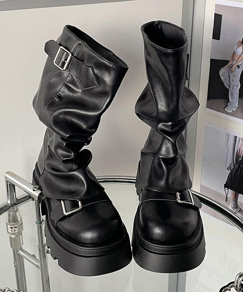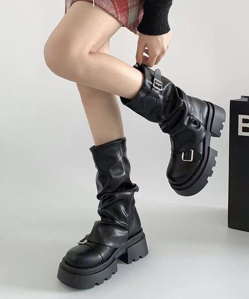 存在感のある厚底ソールに、ベルトディティールがアクセントになったロングブーツ。