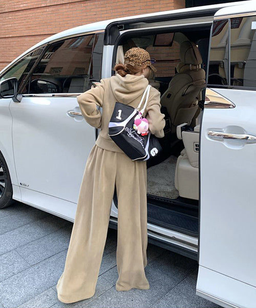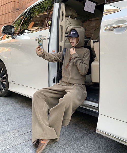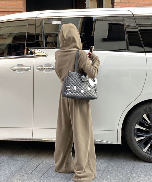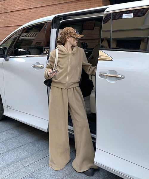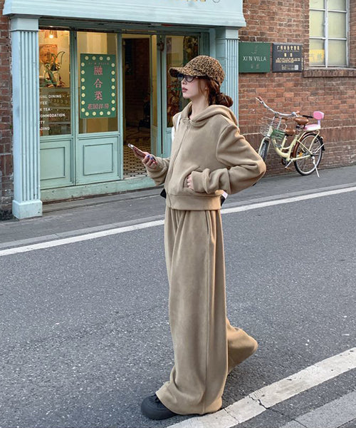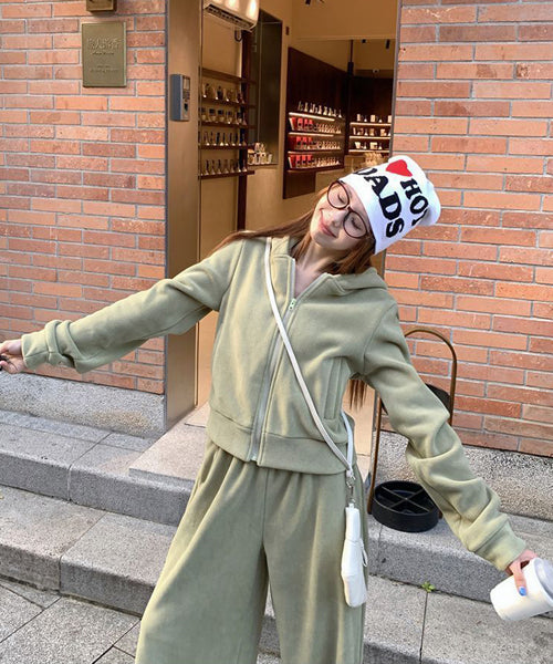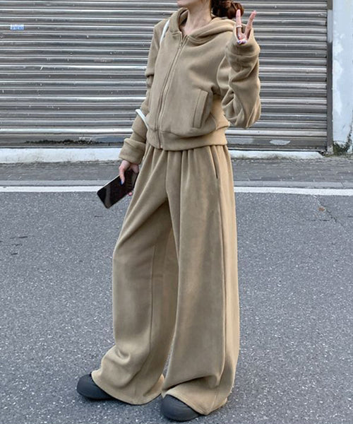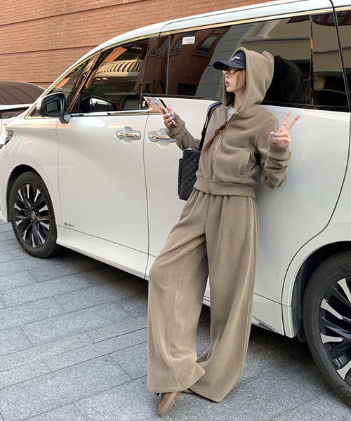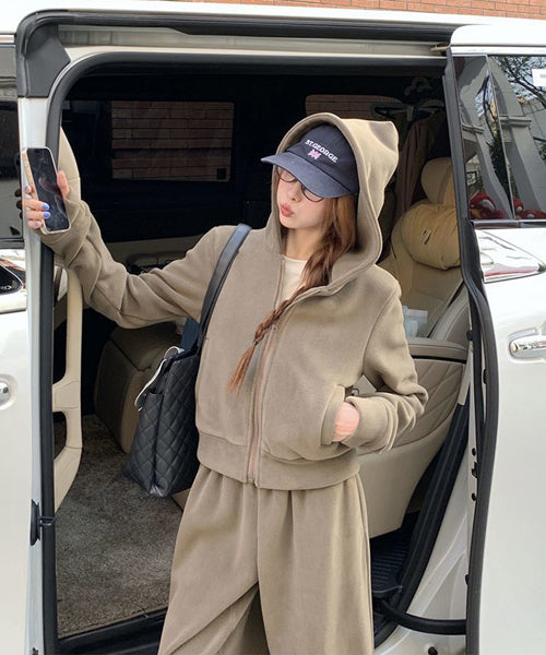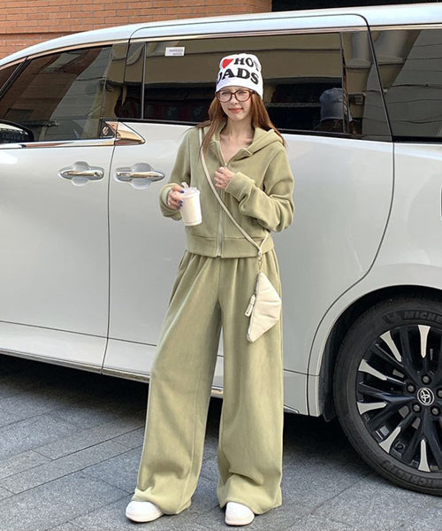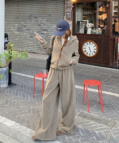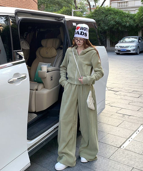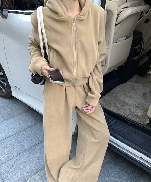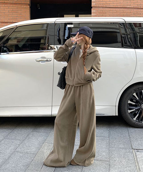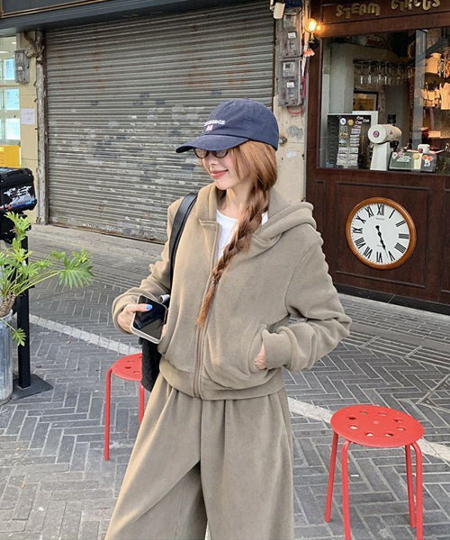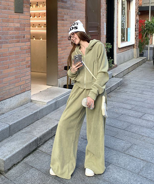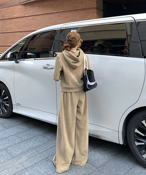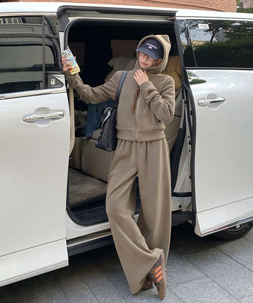 もこもこのフリース素材がシーズンムードを高める、パーカーとワイドパンツのセットアップ。