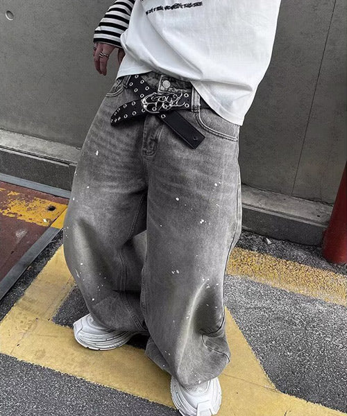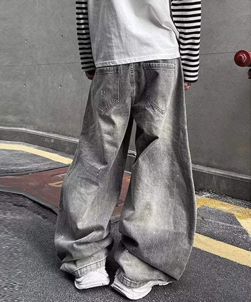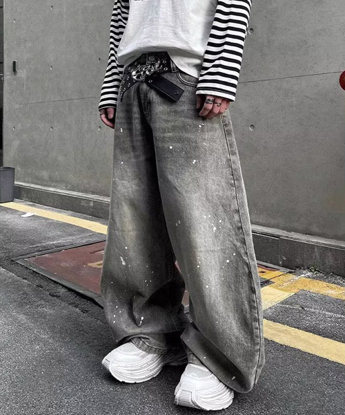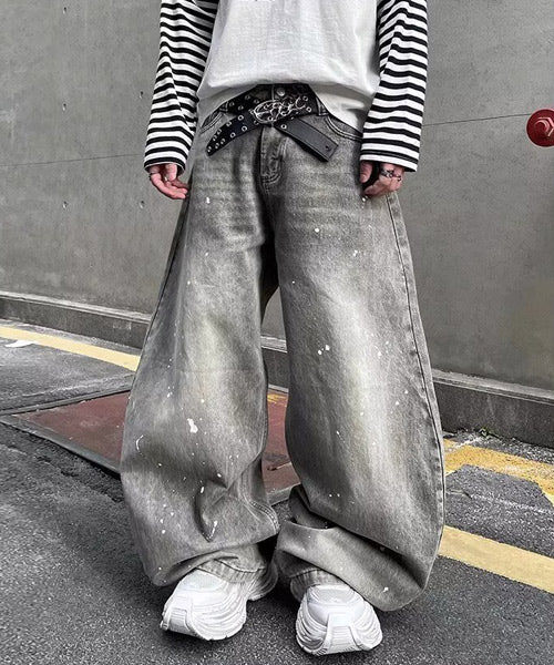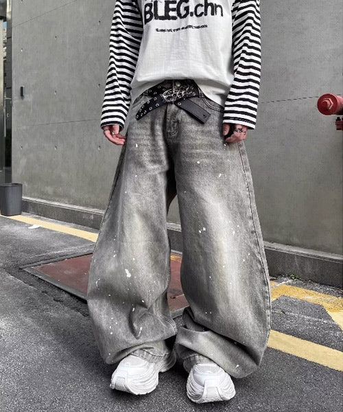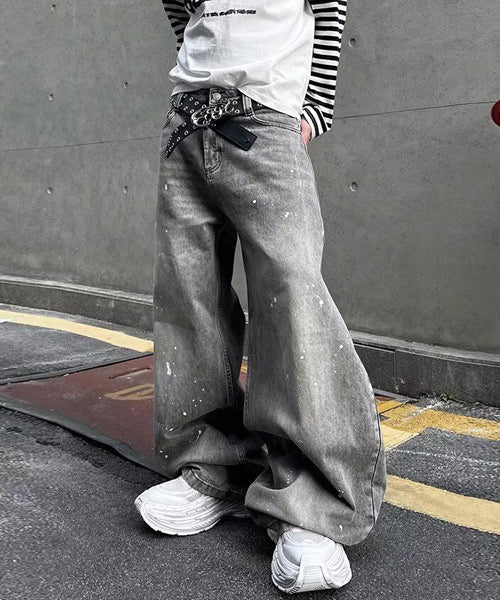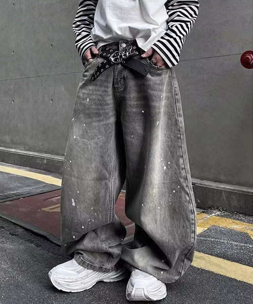 大胆なワイドシルエットにペイント風デザインを落とし込んだ、存在感抜群のデニムパンツ。