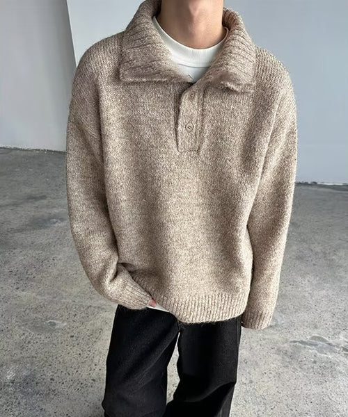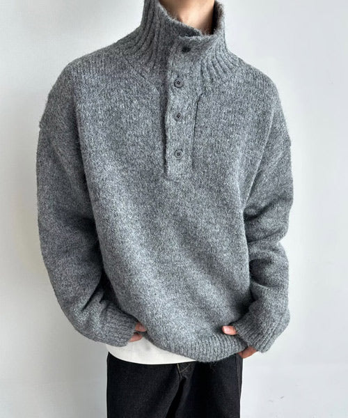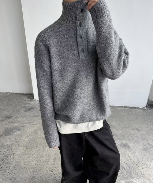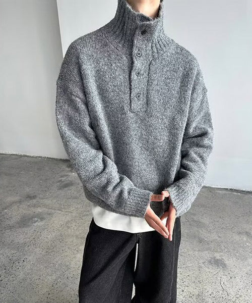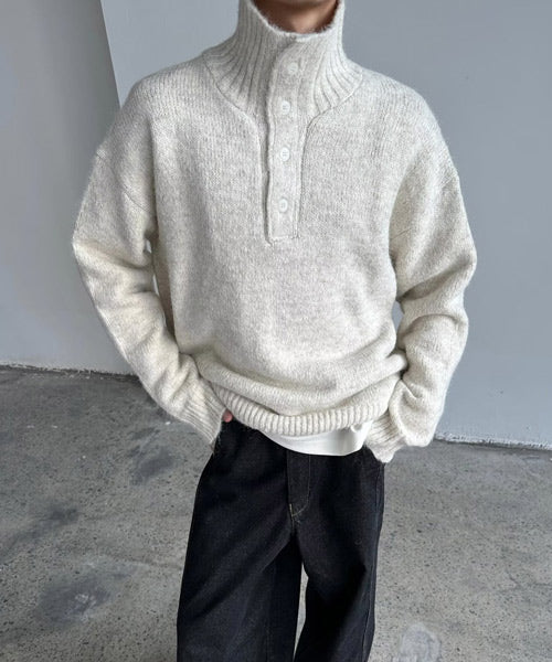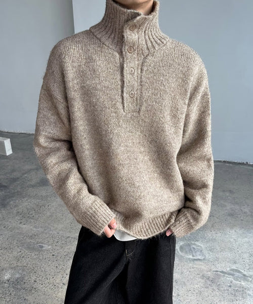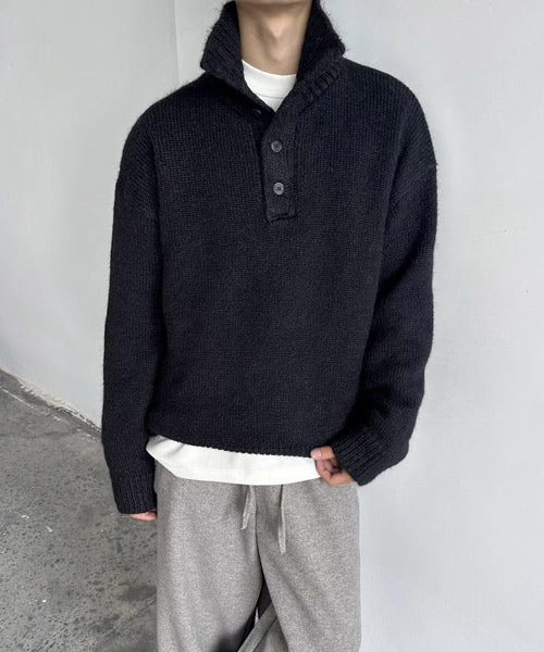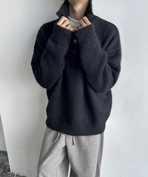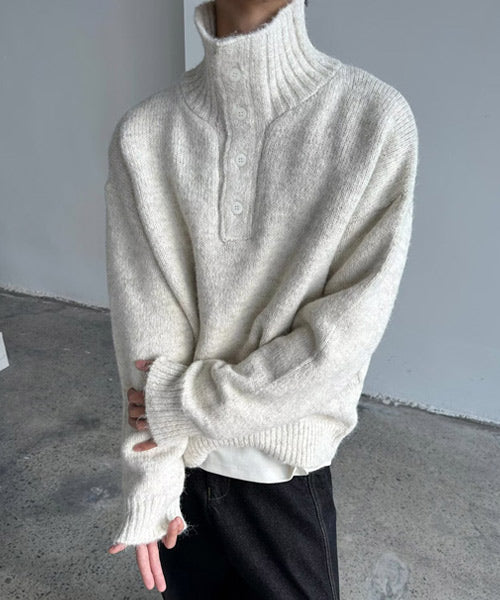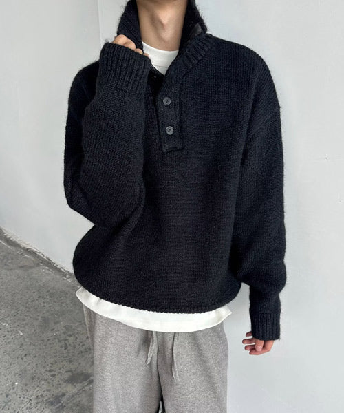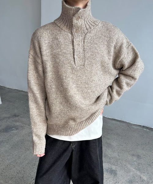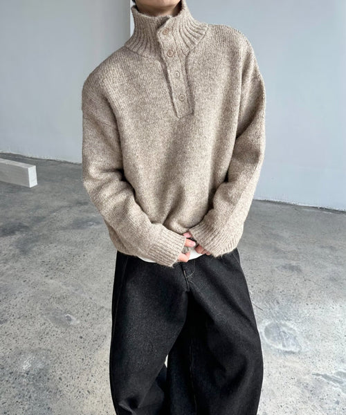 ボタンを留めればスタンドネックにもなる、着こなし自在なデザインニット。