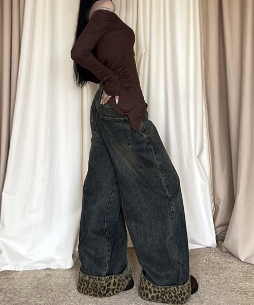 お洒落なレオパード柄とロールアップデザインがアクセントになったワイドデニムパンツ。