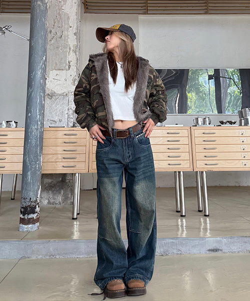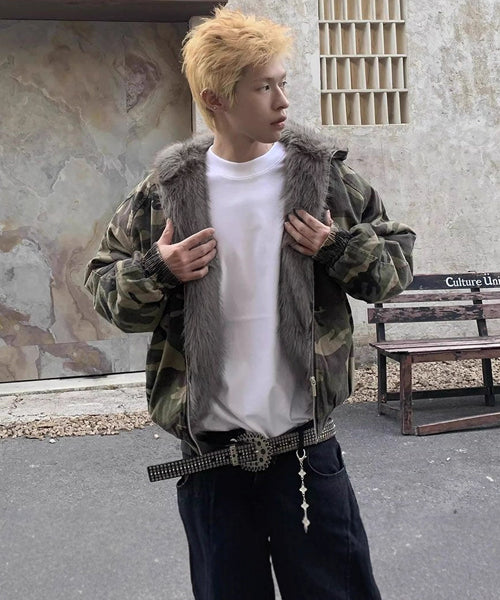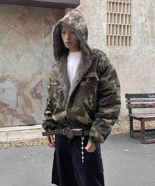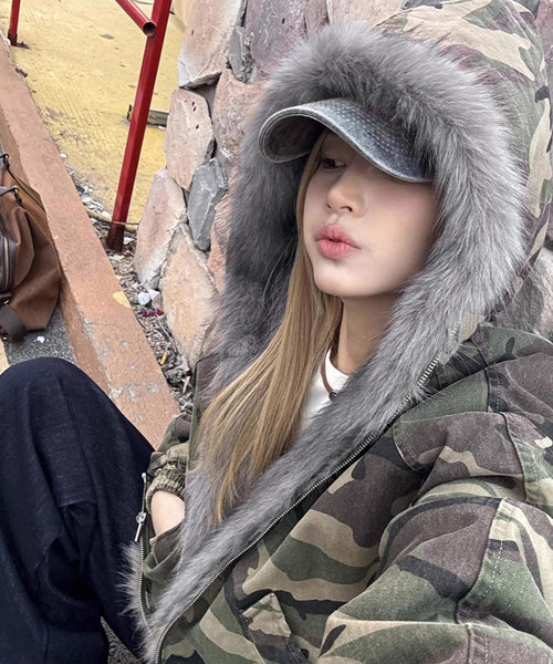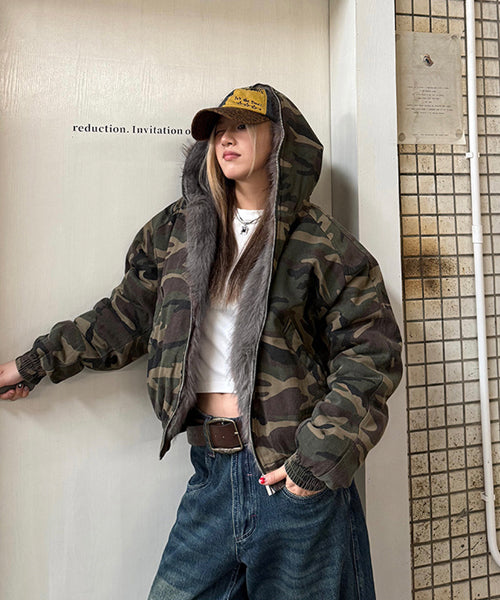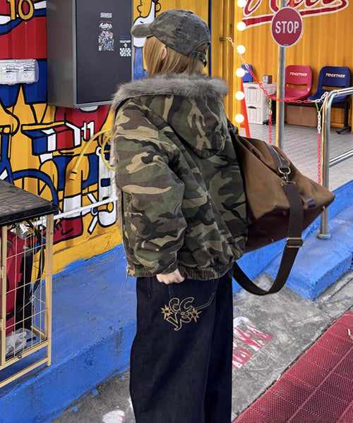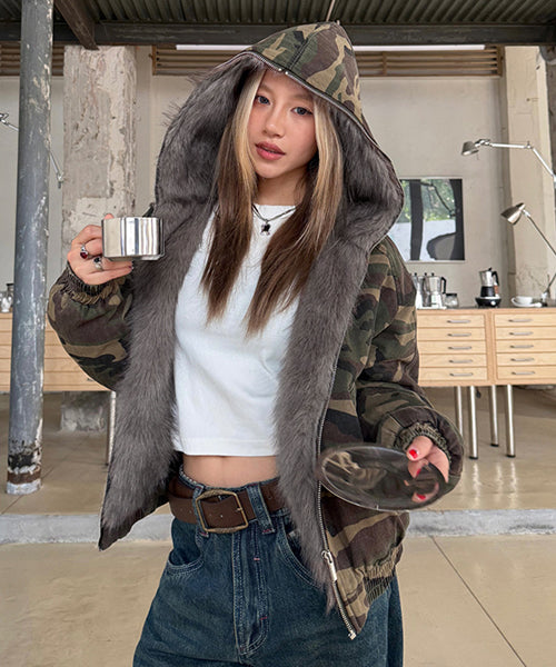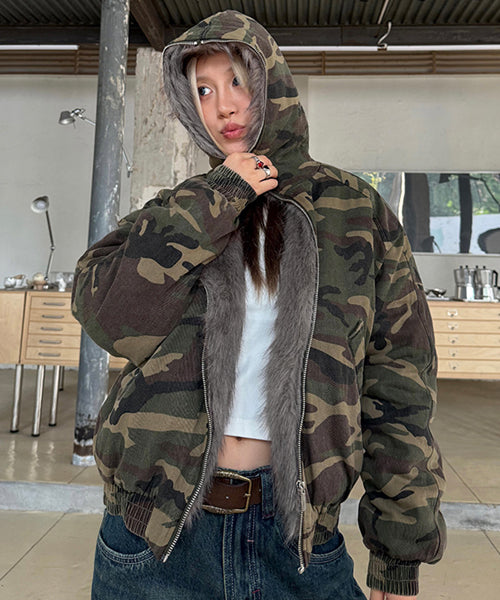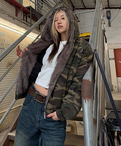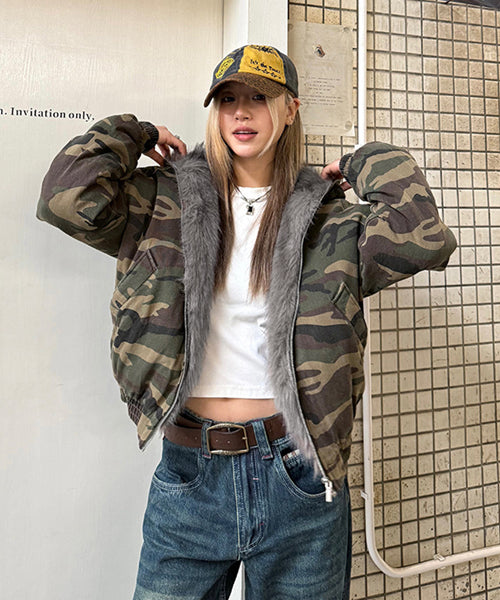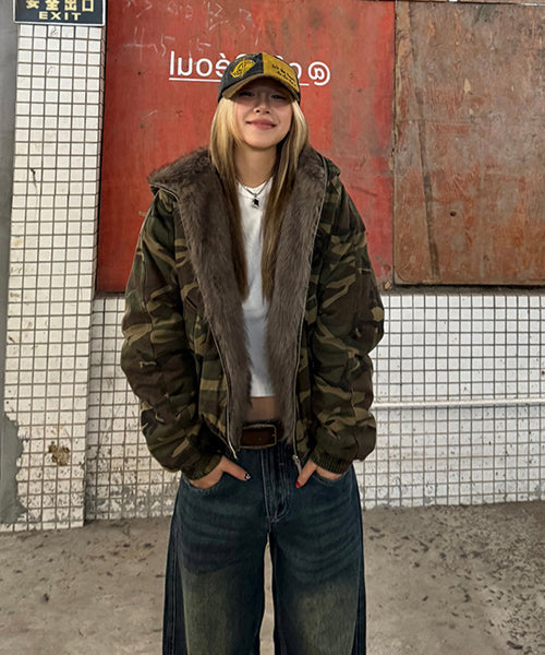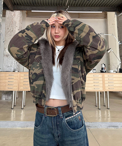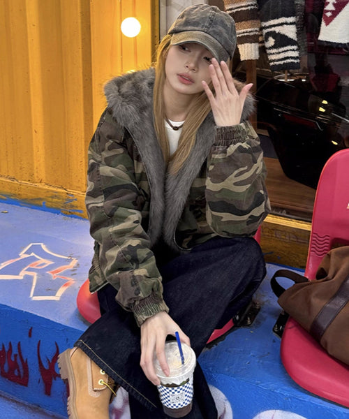 トレンド感たっぷりのカモフラージュ柄に、ふわふわのファーフードを組み合わせたY2Kムード満点の中綿ジャケット。