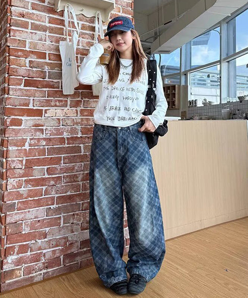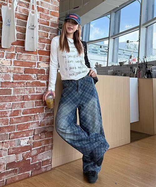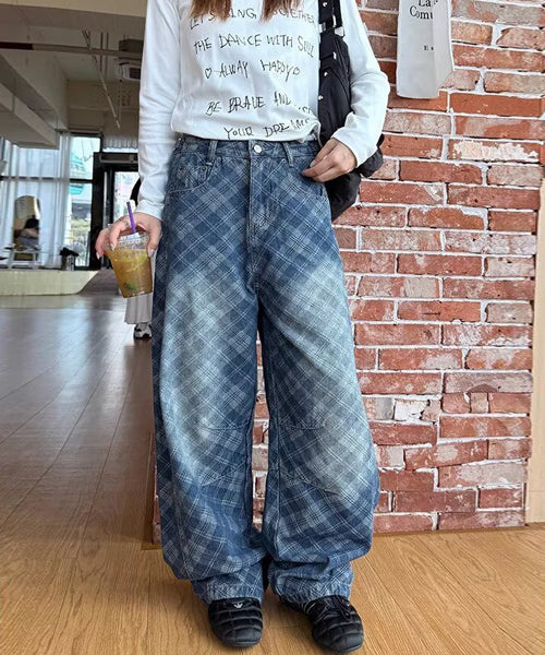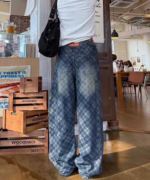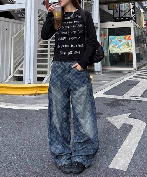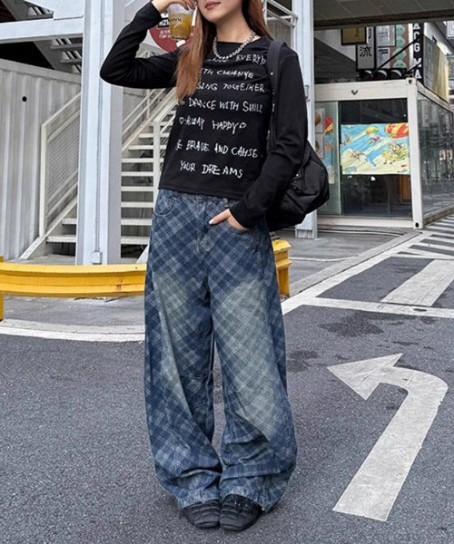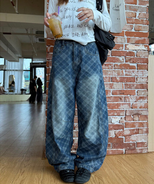 ユーズド加工を効かせた、チェック柄のカーブデニムパンツ。