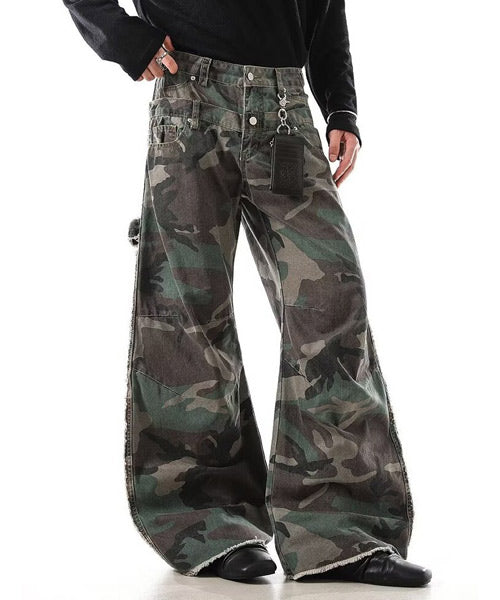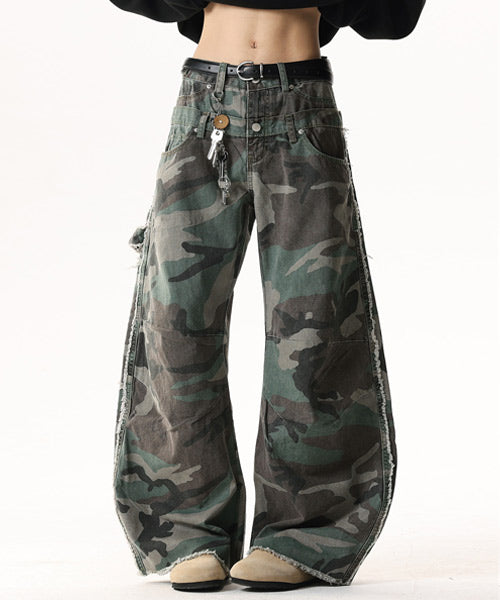 ダブルウエストのレイヤード風ディティールが目を惹く、カモフラージュ柄パンツ。