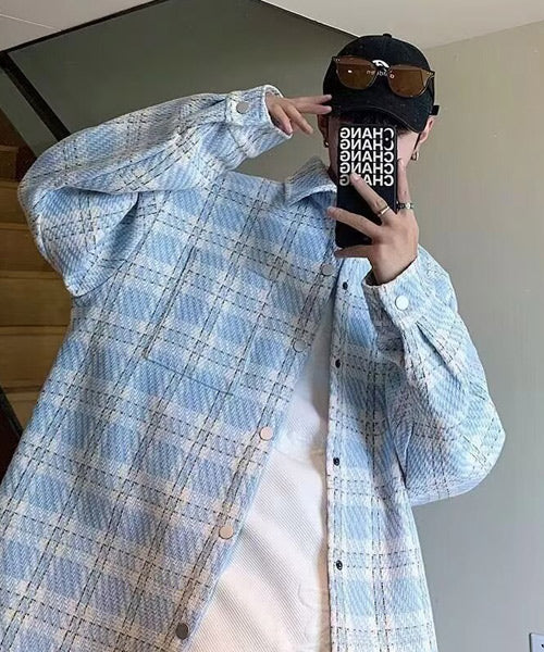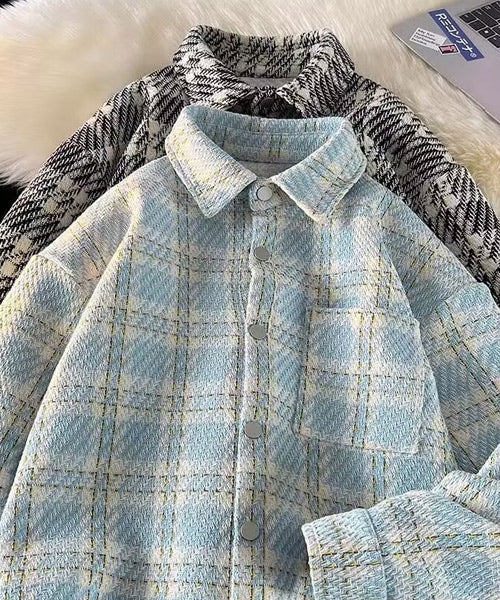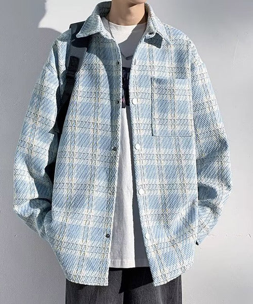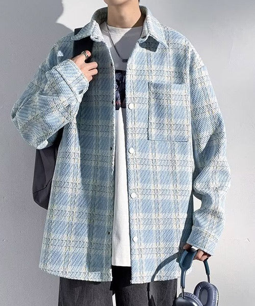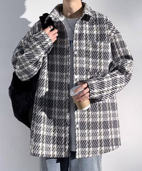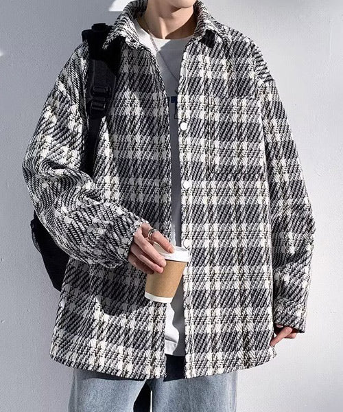 チェック柄のツイードライクな生地が存在感を放つシャツジャケット。