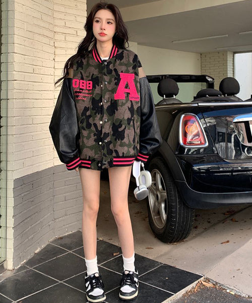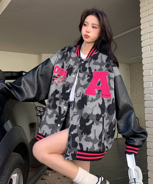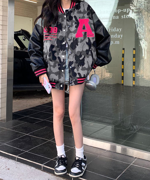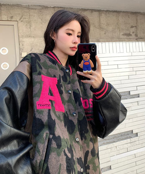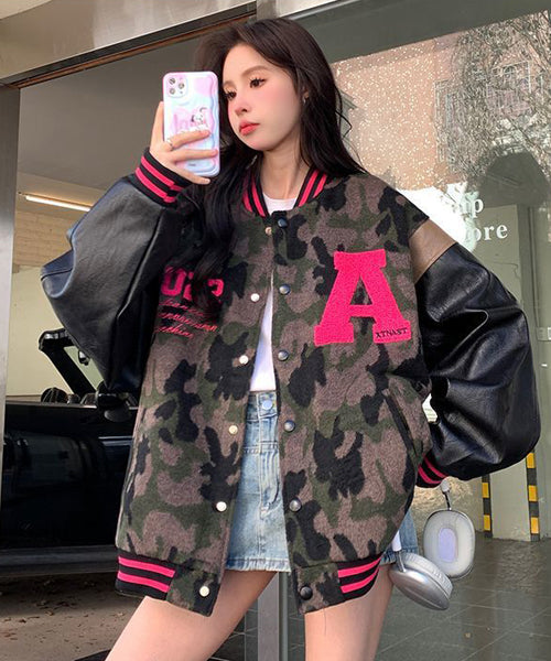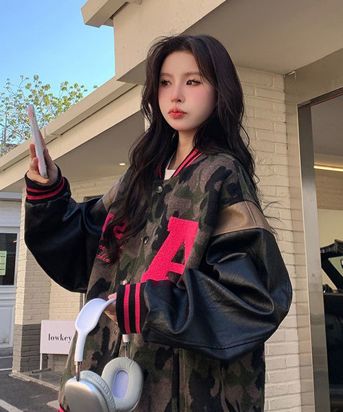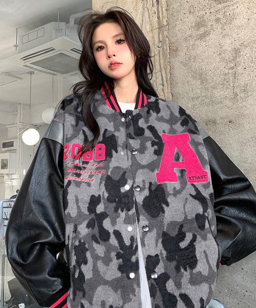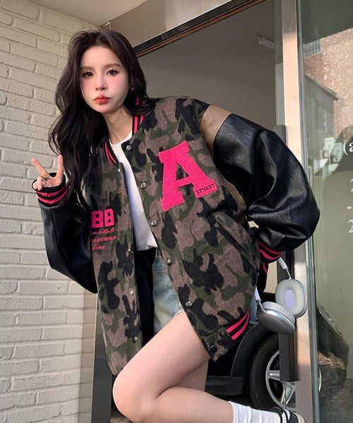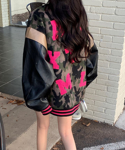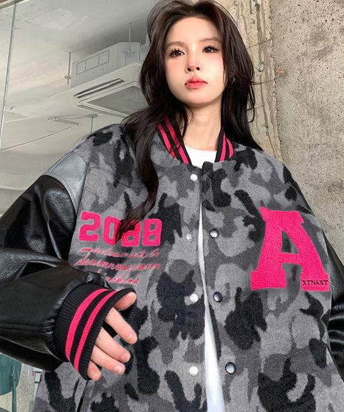 迷彩柄に存在感のあるサガラ刺繍をバックまで贅沢に施した、ストリート映え抜群のスタジャン。