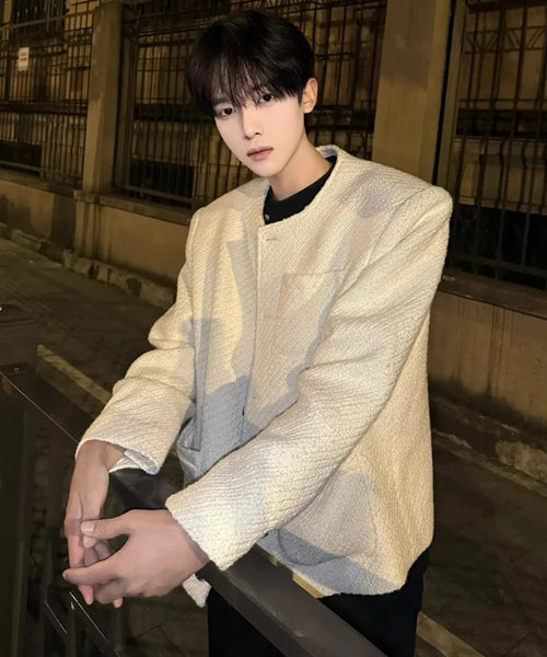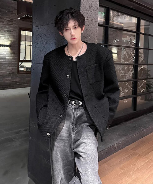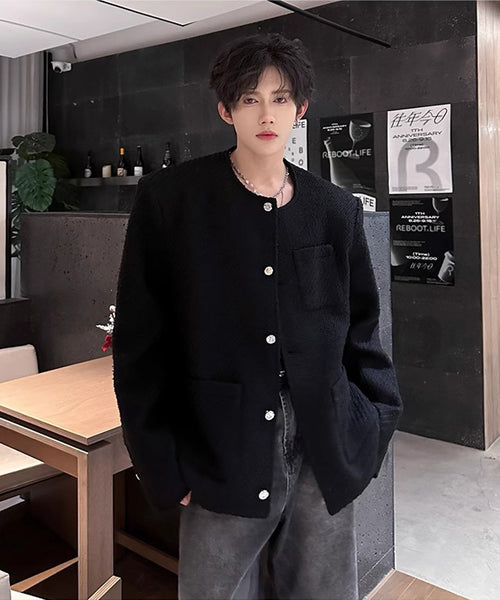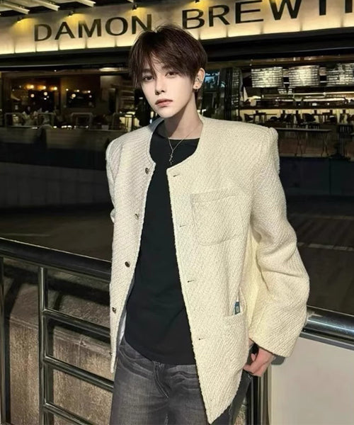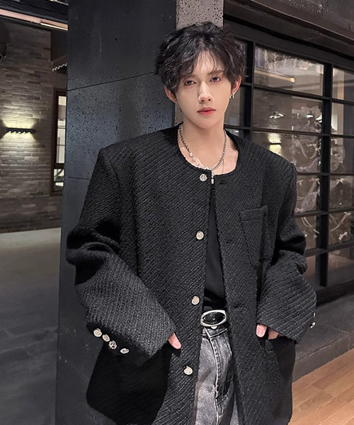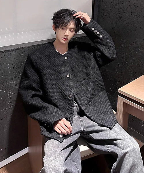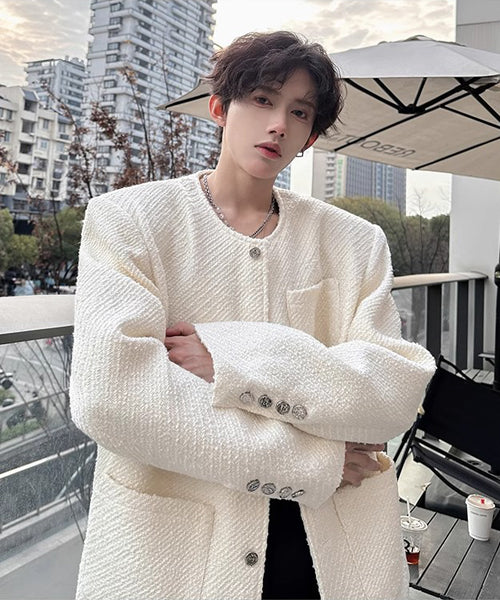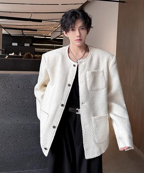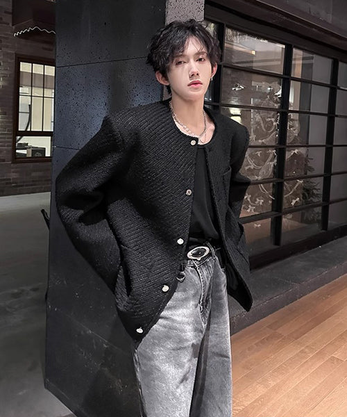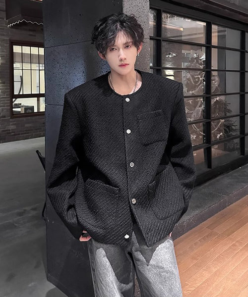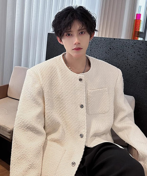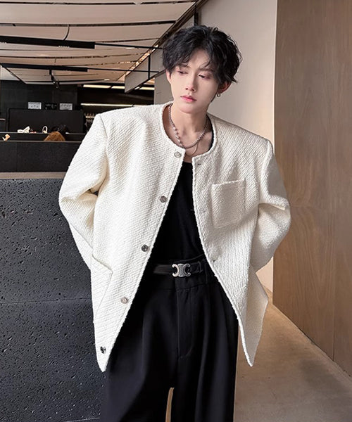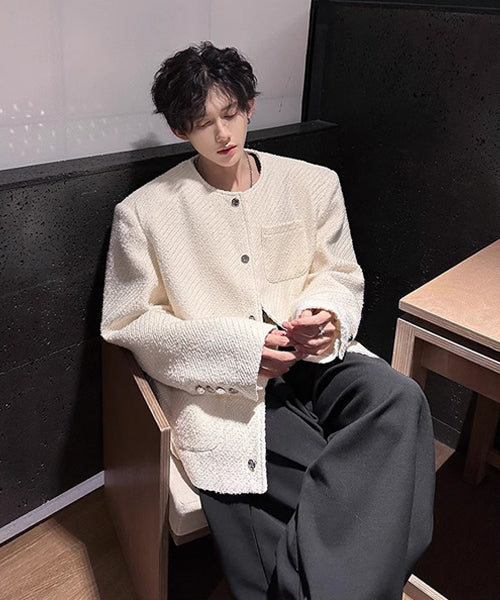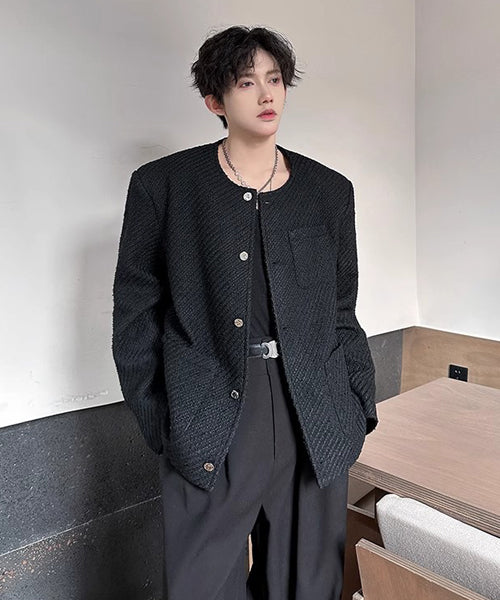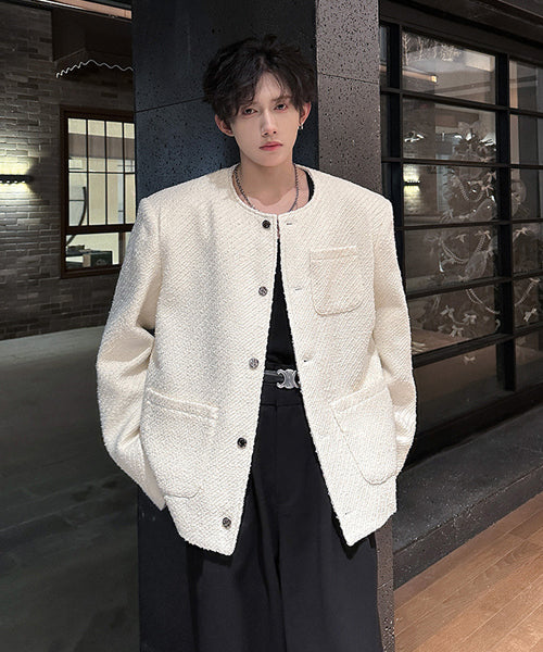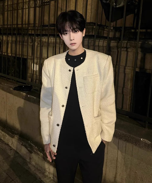 クラシックなツイードをノーカラーで再構築した、モード感漂うジャケット。