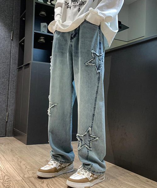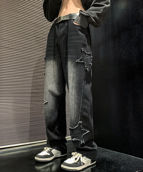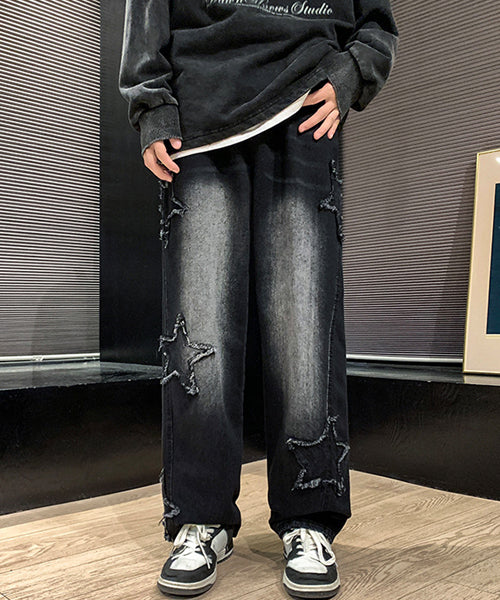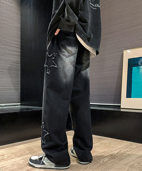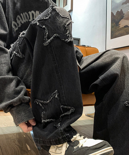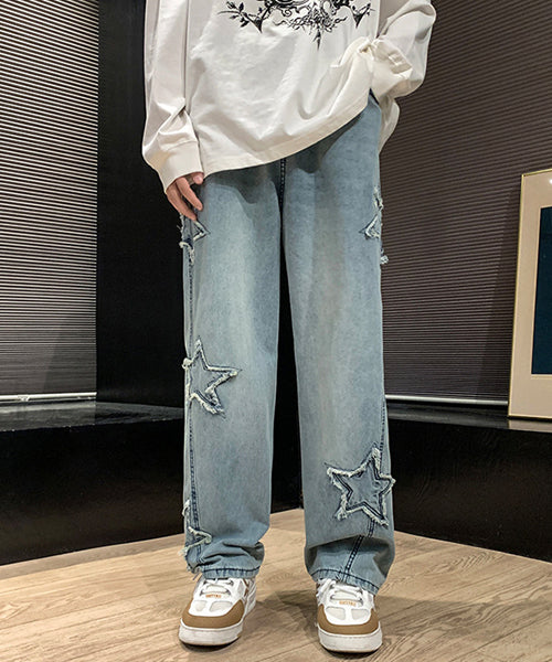 星のモチーフが散りばめられた、存在感抜群のルーズデニムパンツ。