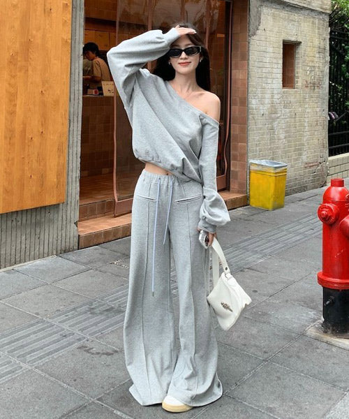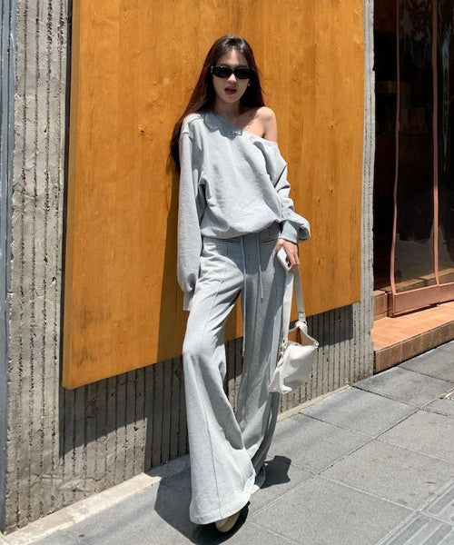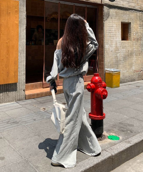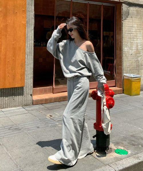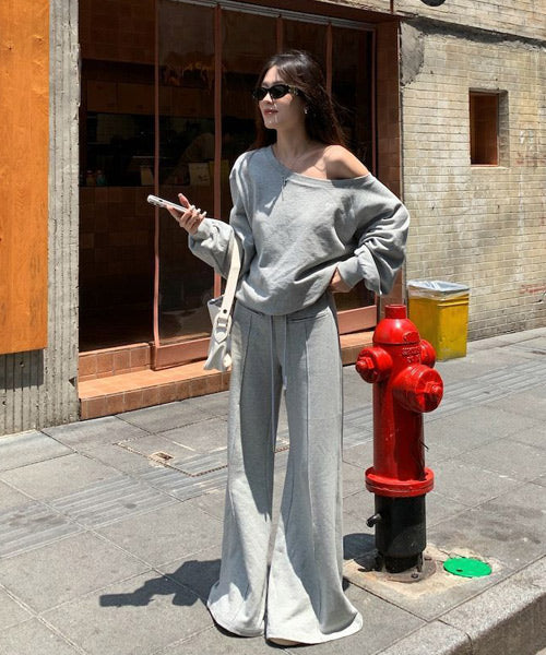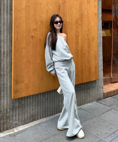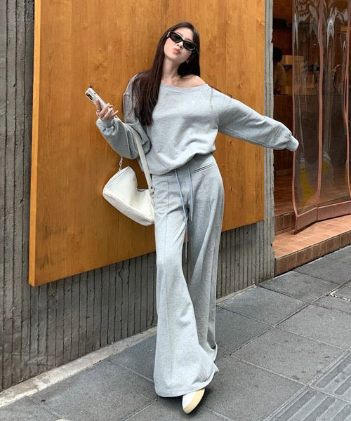 オフショルダーのカットソーとフレアアパンツのセットアップ。