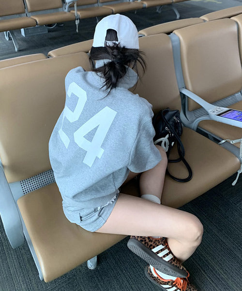 バックプリントが存在感を放つ、フルジップスウェットとショートパンツのセットアップ。