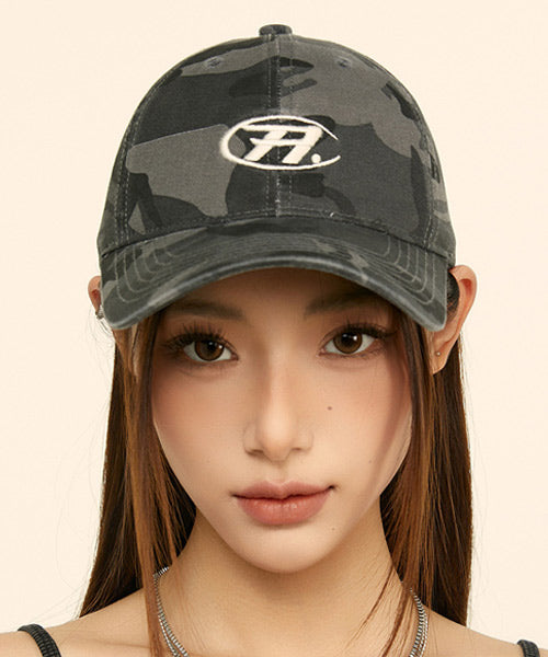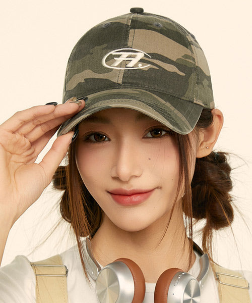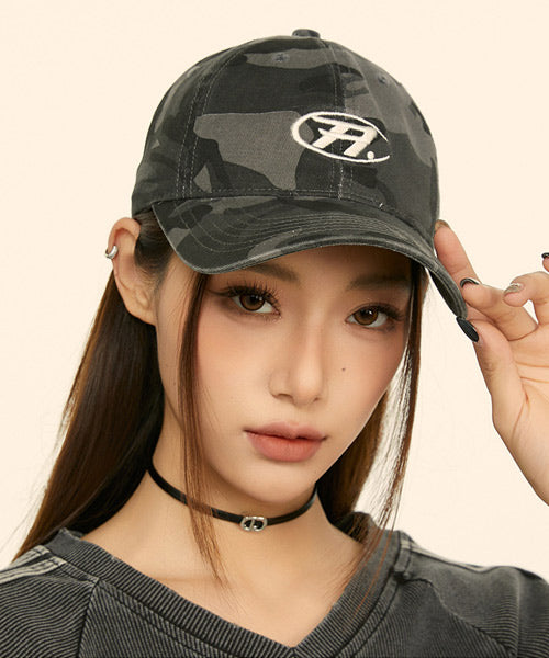 カモフラージュ柄に刺繍ロゴを落とし込み、ストリートとY2Kムードを融合させたベースボールキャップ。
