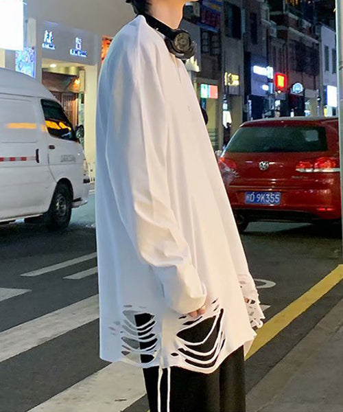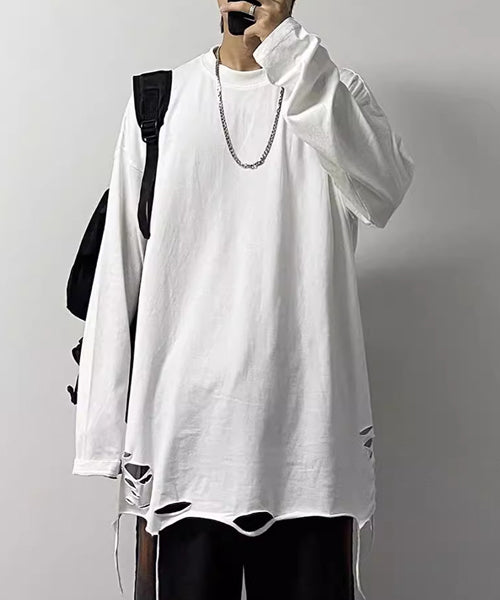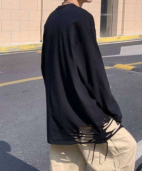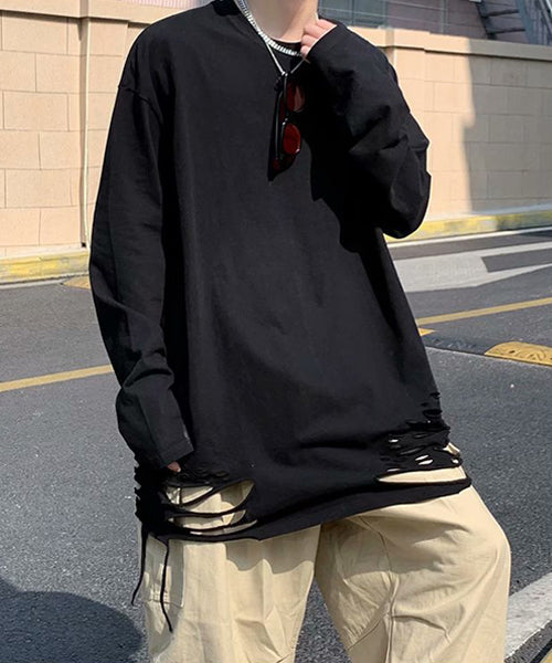 大胆なダメージ加工を施した、存在感抜群の無地の長袖Tシャツ。