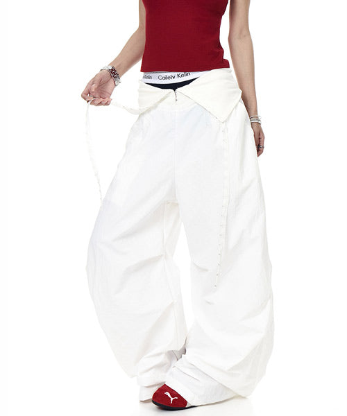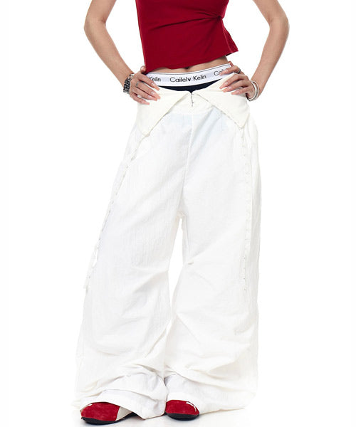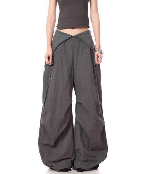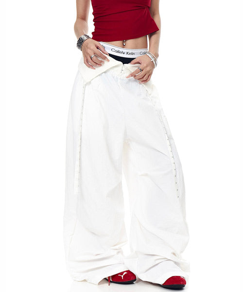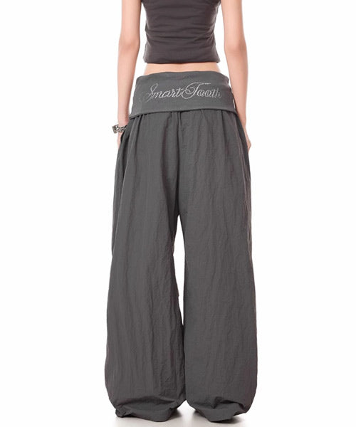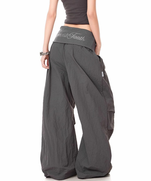 バックに施されたキラキラのロゴが視線を惹くワイドパンツ。