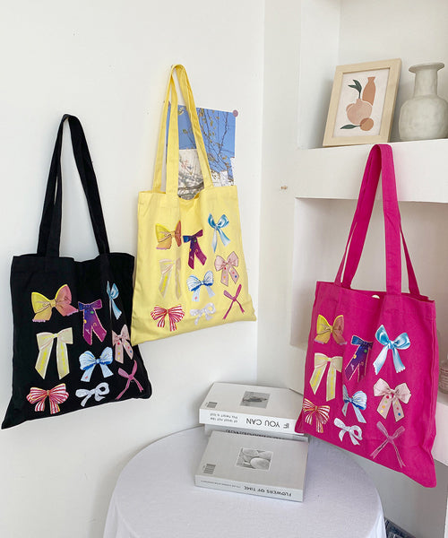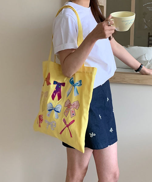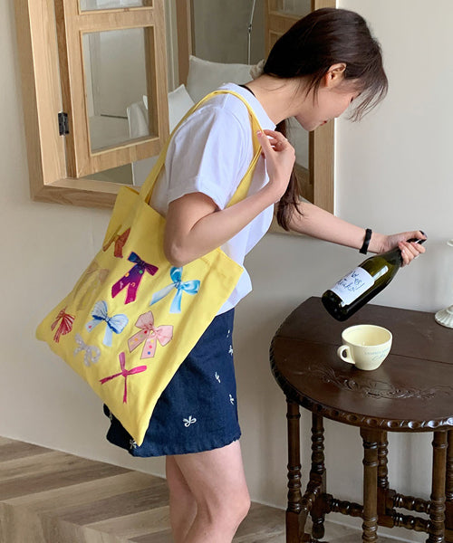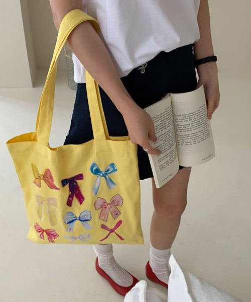 さまざまなデザインのリボンを散りばめた、ガーリーなトートバッグ。