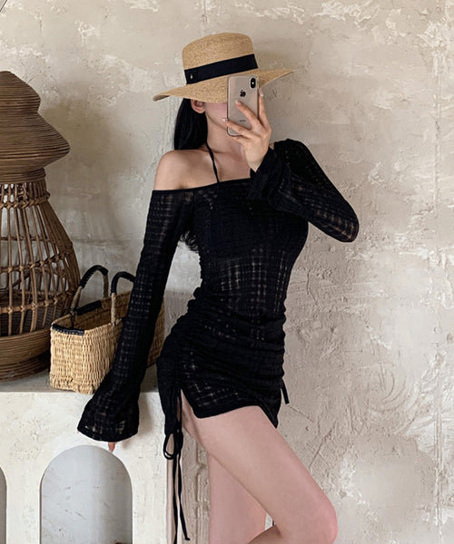 シンプルなビキニにミニワンピースタイプの羽織り付きで、気になる部分をさりげなくカバーできるスイムウェア。